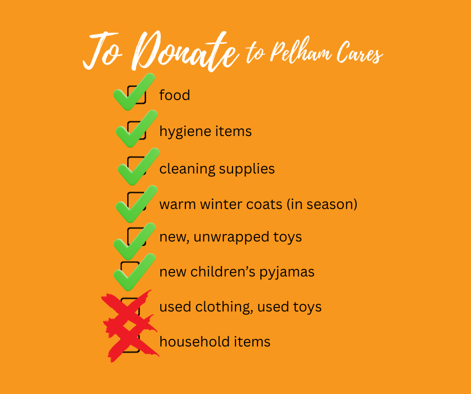 Pelham Cares does not have a Thrift Store, and kindly asks that you do not place clothes, books, furniture or household items in the Food donation bins.  Along with non-perishable food, basic hygiene and cleaning supplies, Pelham Cares accepts specific items for Youth Programs (children’s new school supplies and backpacks) and for Seasonal Programs at relevant times of the year (warm coats and accessories; children’s new pyjamas and new/unwrapped toys).